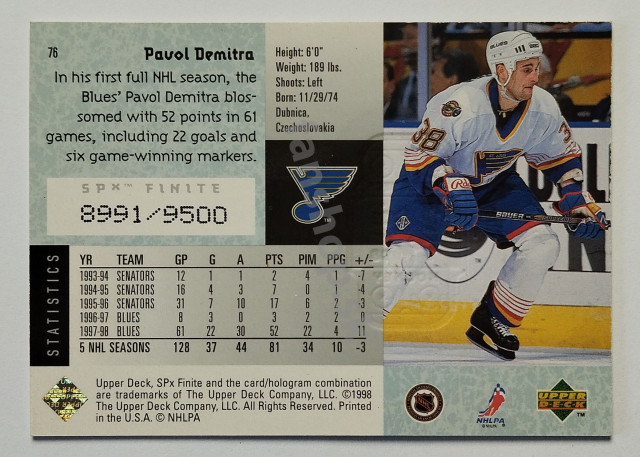 1998-99 SPx Finite #76 Pavol Demitra SN 8991/9500