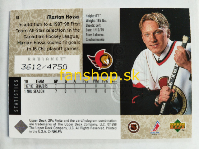 1998-99 SPx Finite Radiance #58 Marián Hossa SN 3612/4750