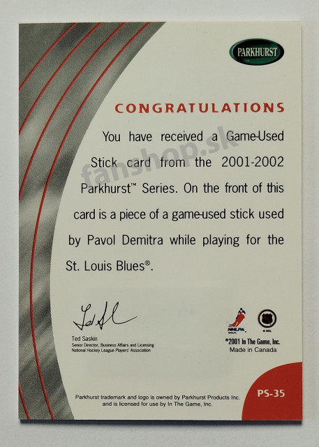 2001-02 Parkhurst Sticks #PS-35 Pavol Demitra PR90 - karta limitovaná do /90, bez sériového čísla