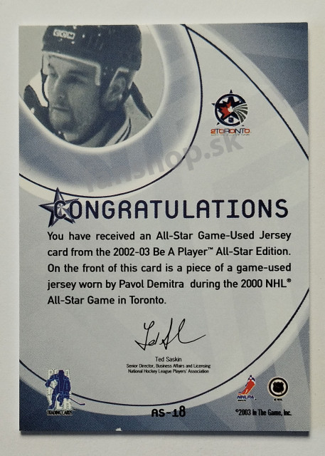 2002-03 Be a Player All-Star Edition Jerseys #AS-18 Pavol Demitra PR100 - karta limitovaná do /100, bez sériového čísla