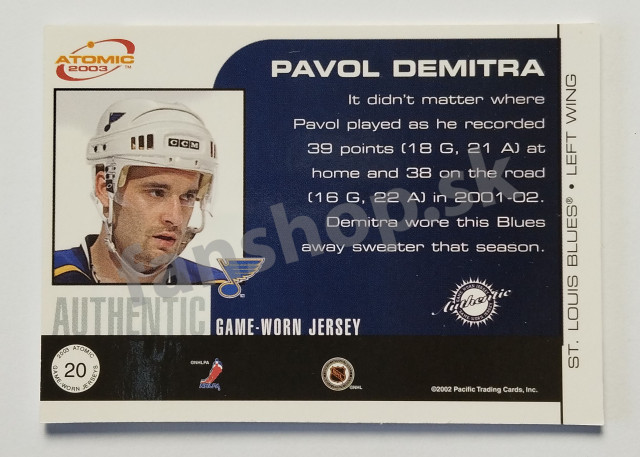 2002-03 Pacific Atomic Authentic Game-Worn Jersey Patch Variation #20 Pavol Demitra SN 107/322
