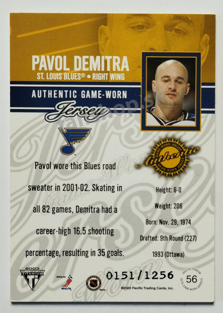 2002-03 Pacific Private Stock Titanium Jerseys #56 Pavol Demitra SN 0151/1256