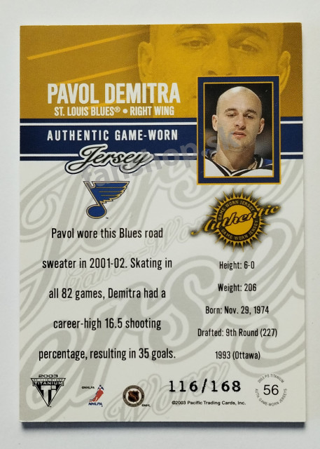 2002-03 Pacific Private Stock Titanium Patches #56 Pavol Demitra SN 116/168