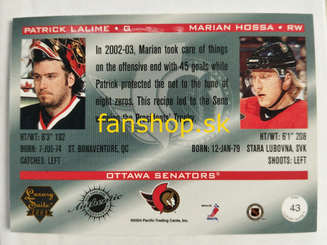 2003-04 Pacific Luxury Suite #43a Marián Hossa / Patrick Lalime SN 101/650