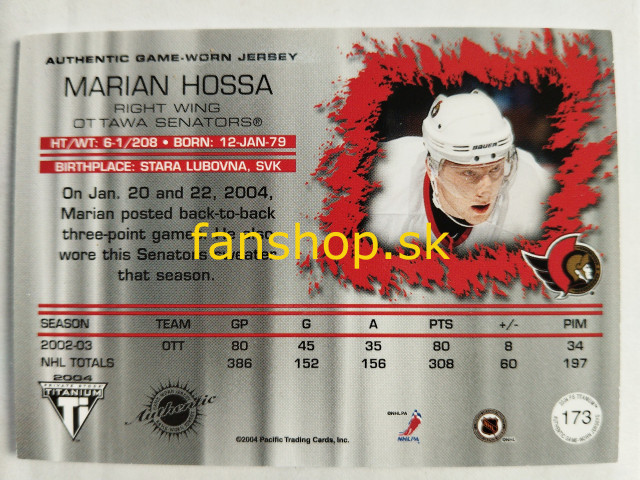 2003-04 Pacific Private Stock Titanium Authentic Game-Worn Jersey Patch #173 Marián Hossa SN 045/155