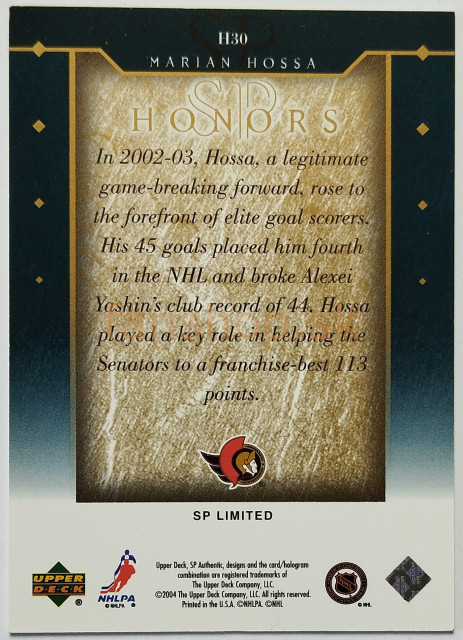 2003-04 SP Authentic SP Honors SP Limited #H30 Marián Hossa SN 57/99