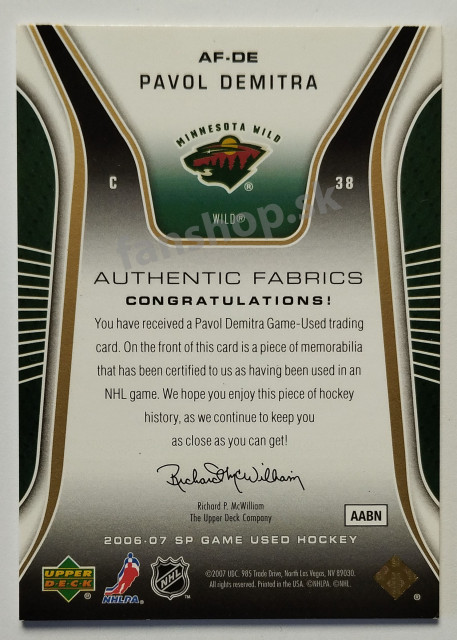 2006-07 SP Game Used Authentic Fabrics Parallel #AF-DE Pavol Demitra SN 007/100