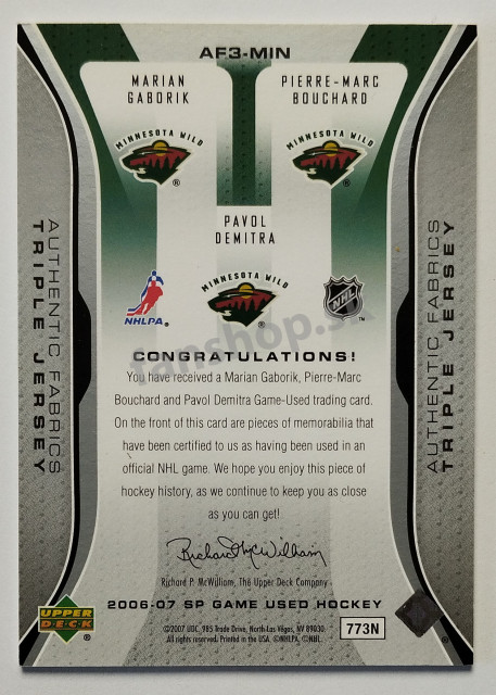 2006-07 SP Game Used Authentic Fabrics Triple #AF3-MIN Demitra/Gáborík/Bouchard SN 06/25