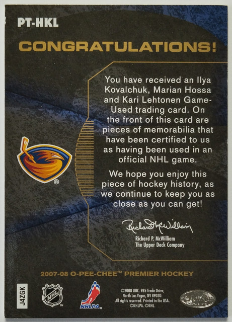 2007-08 O-Pee-Chee Premier Rare Remnants Triples Gold #PT-HKL Hossa / Kovalchuk / Lehtonen SN 35/35