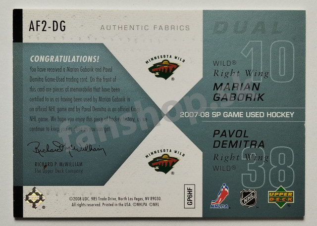 2007-08 SP Game Used Authentic Fabrics Duals #AF2-DG Pavol Demitra/Marián Gáborík SN 011/100