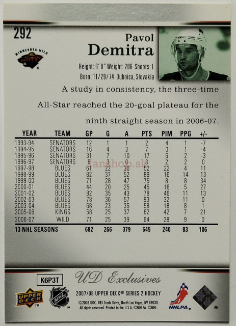 2007-08 Upper Deck Exclusives #292 Pavol Demitra SN 021/100