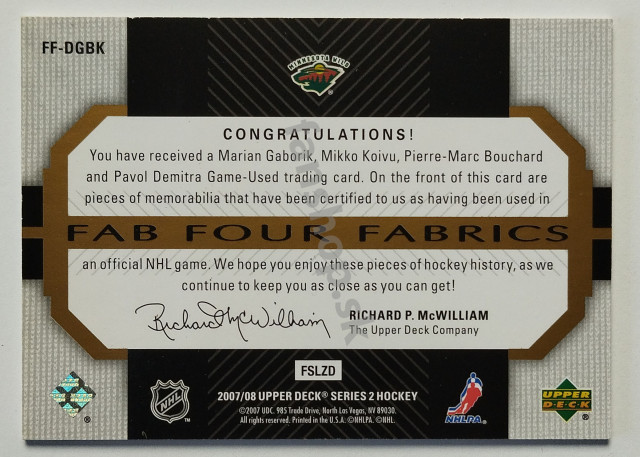 2007-08 Upper Deck Fab Four Fabrics #FF-DGBK Demitra/Gáborík/Buchard/Koivu SN 039/100