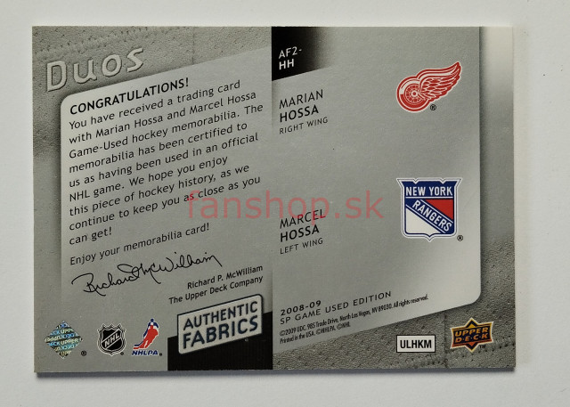 2008-09 SP Game Used Authentic Fabrics Duos #AF2-HH Marián Hossa / Marcel Hossa SN 091/100