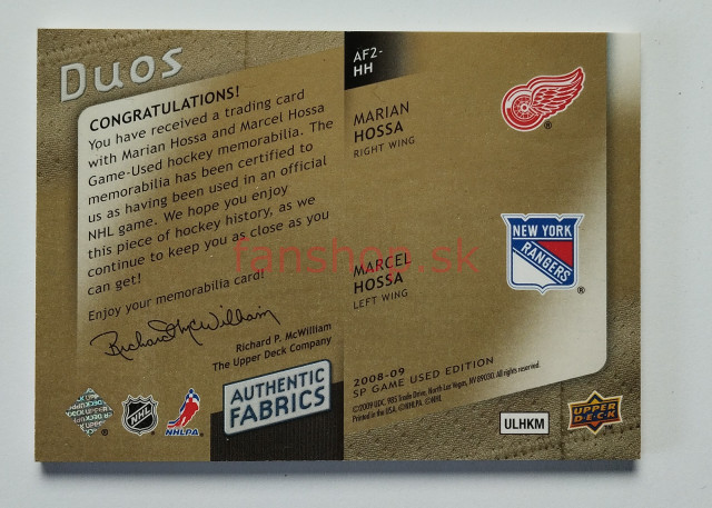 2008-09 SP Game Used Authentic Fabrics Duos Patches #AF2-HH Marián Hossa / Marcel Hossa SN 05/25