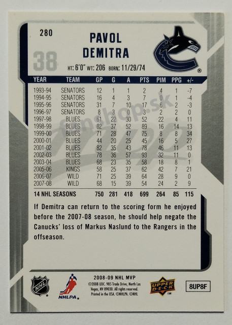 2008-09 Upper Deck MVP Super Script #280 Pavol Demitra SN 12/25