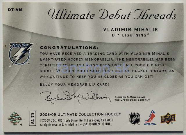 2008-09 Upper Deck Ultimate Collection Debut Threads #DT-VM Vladimír Mihálik SN 168/200