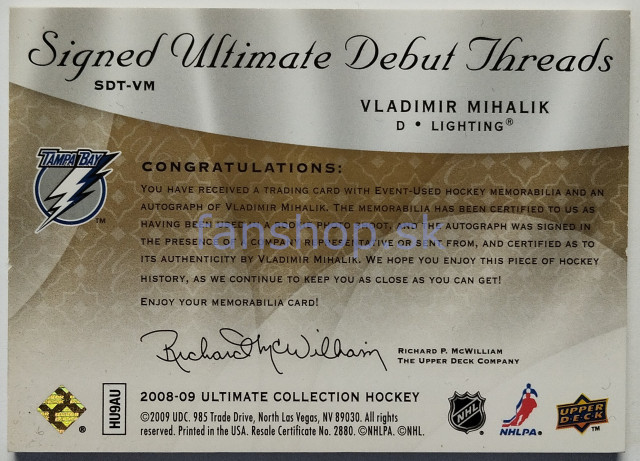 2008-09 Upper Deck Ultimate Collection Debut Threads Patches Autographs #SDT-VM Vladimír Mihálik SN 10/10