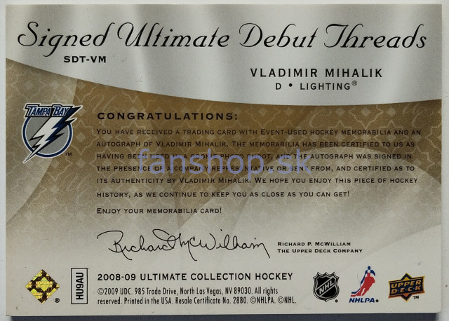 2008-09 Upper Deck Ultimate Collection Debut Threads Patches Autographs #SDT-VM Vladimír Mihálik SN 08/10