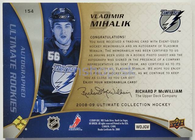 2008-09 Upper Deck Ultimate Collection Rookie Patch Autographs #154 Vladimír Mihálik SN 10/25