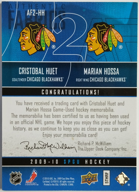 2009-10 SP Game Used Authentic Fabrics Dual Patches #AF2-HH Marián Hossa / Cristobal Huet SN 05/25