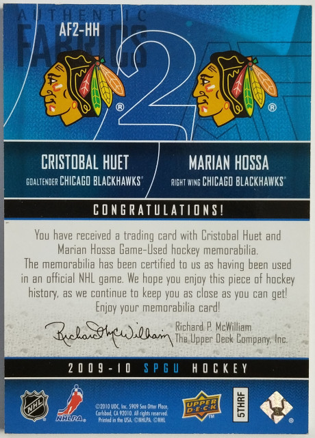 2009-10 SP Game Used Authentic Fabrics Dual Patches #AF2-HH Marián Hossa / Cristobal Huet SN 07/25