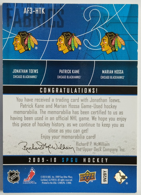 2009-10 SP Game Used Authentic Fabrics Triples Patches #AF3-HTK Hossa / Toews / Kane SN 12/15