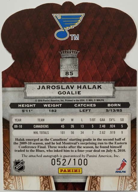 2010-11 Panini Crown Royale Premiere Date Signature #85 Jaroslav Halák SN 052/100