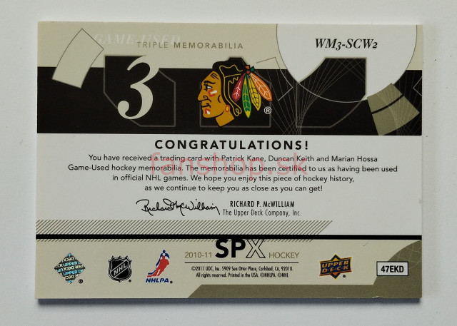 2010-11 SPx Winning Trios #WM3-SCW2 Duncan Keith / Marián Hossa / Patrick Kane SN 17/50