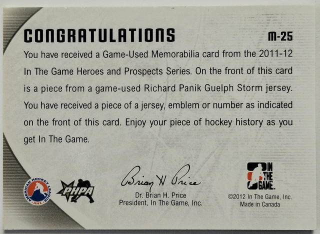2011-12 In The Game Heroes and Prospects Game Used Jersey Gold #M25 Richard Pánik PR10