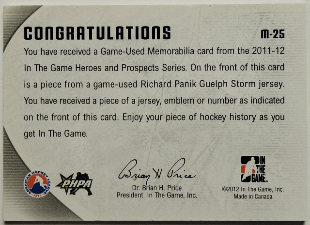 2011-12 In The Game Heroes and Prospects Game Used Jersey Silver #M25 Richard Pánik PR30