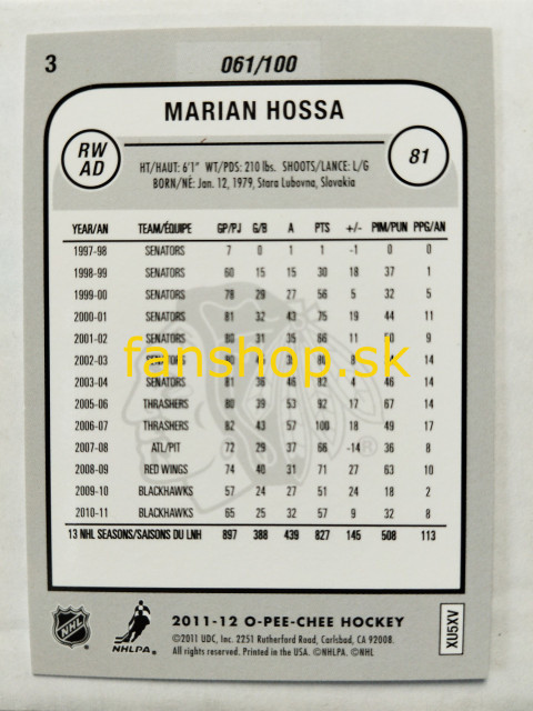 2011-12 O-Pee-Chee Black Rainbow #3 Marián Hossa SN 061/100