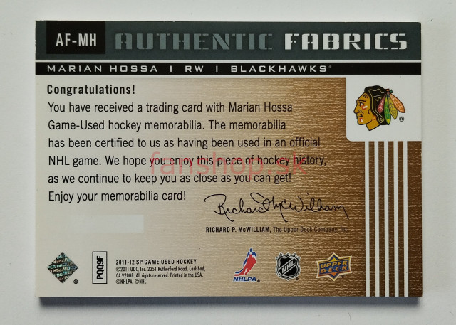 2011-12 SP Game Used Authentic Fabrics Patches #AF-MH Marián Hossa SN 08/35