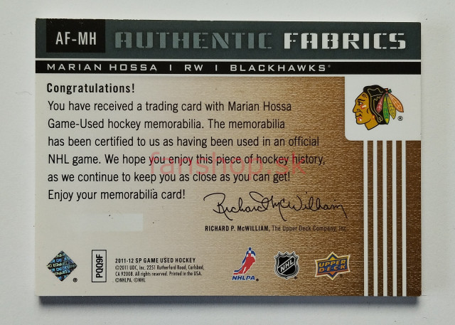2011-12 SP Game Used Authentic Fabrics Patches #AF-MH Marián Hossa SN 30/35