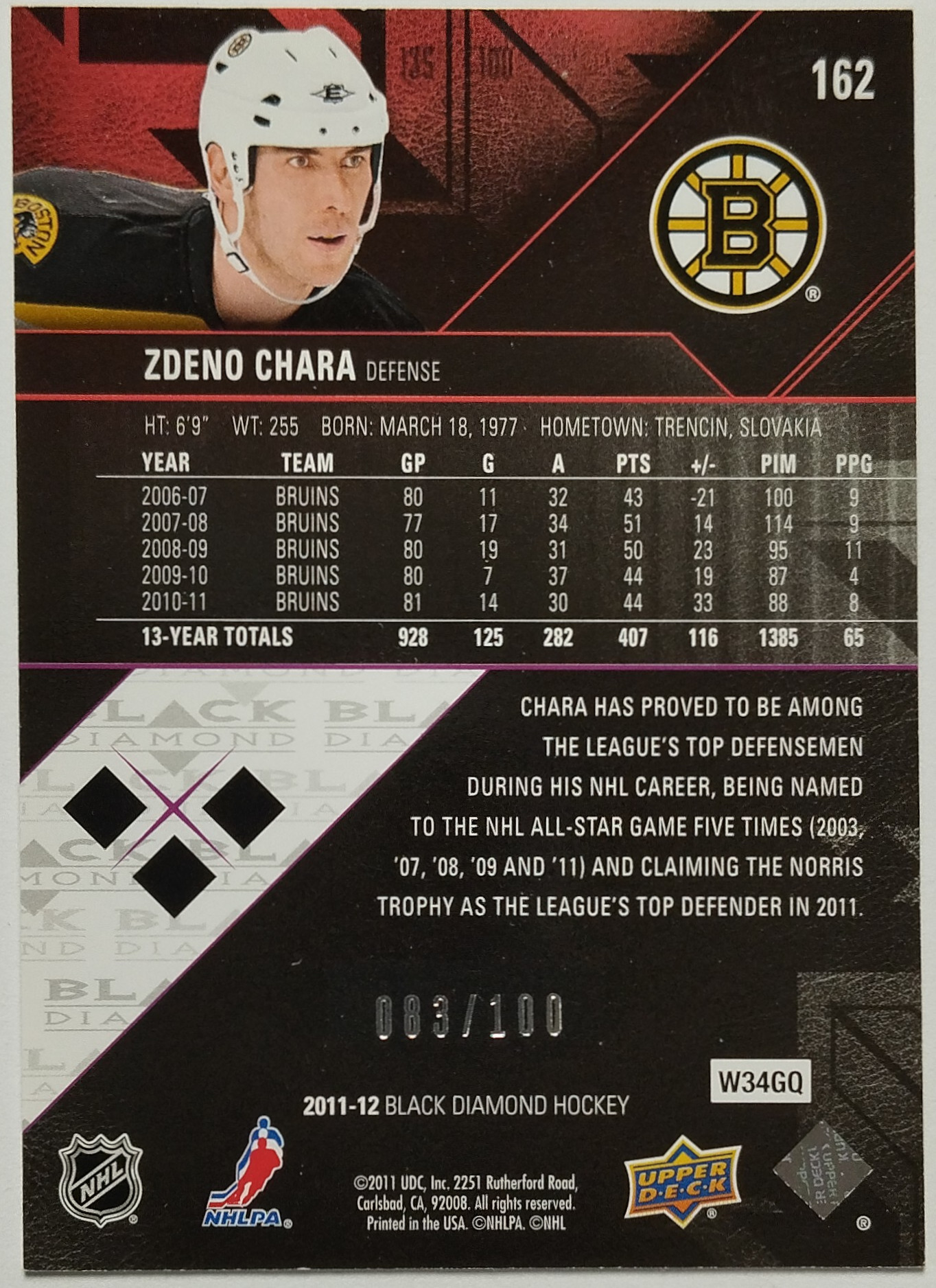 2011-12 Upper Deck Black Diamond Ruby #162 Zdeno Chára SN 083/100