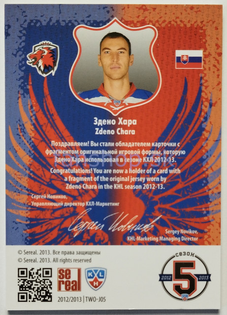 2012-13 Sereal KHL All-Star Game - Two Worlds One Game Jersey #TWO-J05 Zdeno Chára SN 161/200