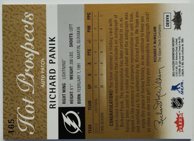 2013-14 Fleer Showcase Hot Prospects Auto Patch #165 Richard Pánik RC SN 300/375