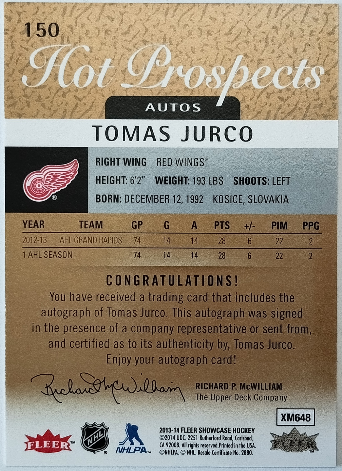 2013-14 Fleer Showcase Hot Prospects Autos #150 Tomáš Jurčo RC SN 110/149