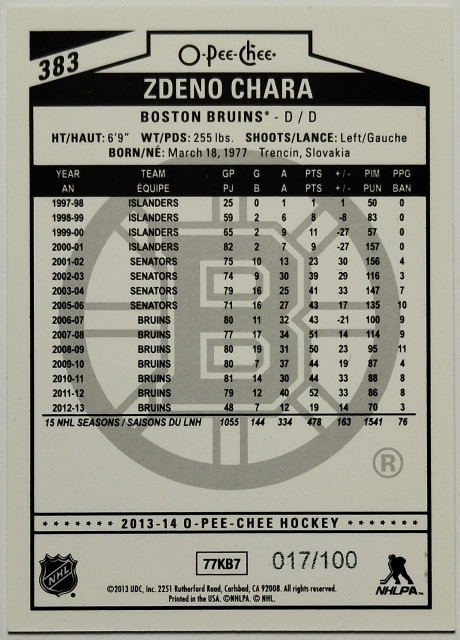 2013-14 O-Pee-Chee Black Rainbow #383 Zdeno Chára SN 017/100