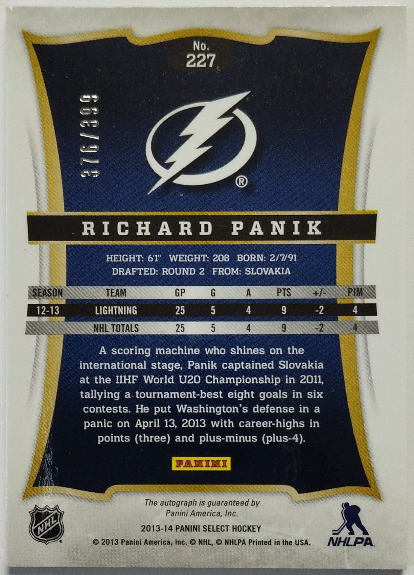 2013-14 Panini Select #227 Richard Pánik RC SN 376/399