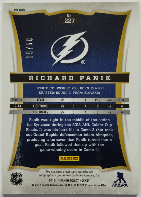 2013-14 Panini Select Rookies Jersey Autographs Prime #227 Richard Pánik SN 15/50