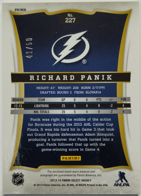 2013-14 Panini Select Rookies Jersey Autographs Prime #227 Richard Pánik SN 41/50