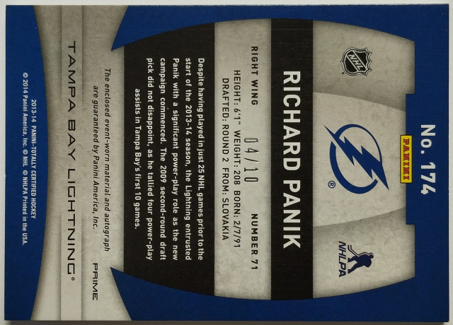 2013-14 Panini Totally Certified Rookie Auto Jerseys Prime Mirror PB #174 Richard Pánik SN 04/10