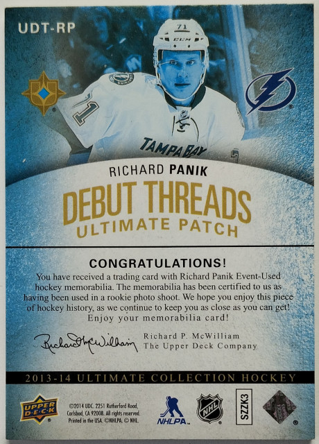 2013-14 Upper Deck Ultimate Collection Debut Threads Patches #UDT-RP Richard Pánik SN 023/100