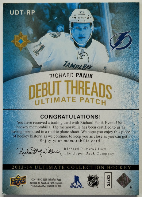 2013-14 Upper Deck Ultimate Collection Debut Threads Patches #UDT-RP Richard Pánik SN 063/100