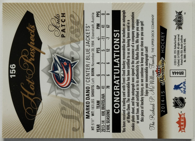 2014-15 Fleer Showcase Hot Prospects Auto Patch #156 Marko Daňo SN 032/375