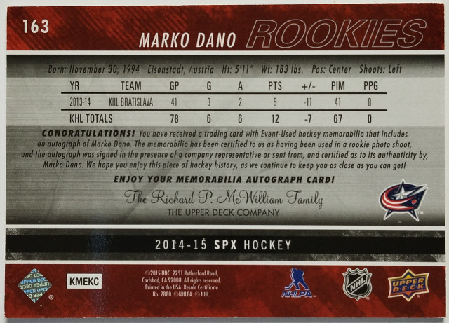 2014-15 SPx Rookies Autograph Jersey #163 Marko Daňo SN 260/399