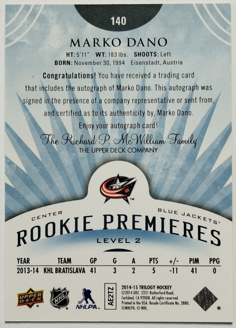 2014-15 Upper Deck Trilogy Rookie Premieres Level 2 Radiant Blue #140 Marko Daňo RC SN 088/225