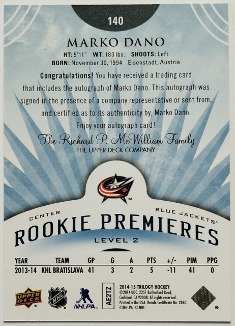 2014-15 Upper Deck Trilogy Rookie Premieres Level 2 Radiant Blue #140 Marko Daňo RC SN 157/225