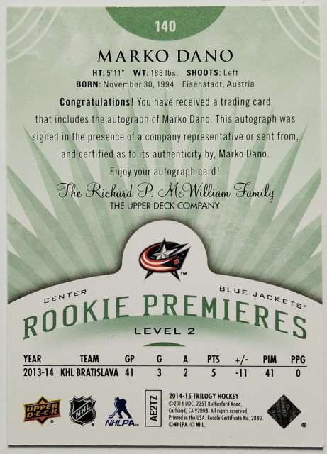 2014-15 Upper Deck Trilogy Rookie Premieres Level 2 Radiant Green #140 Marko Daňo RC SN 06/99