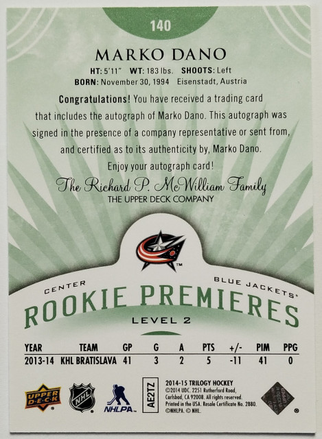 2014-15 Upper Deck Trilogy Rookie Premieres Level 2 Radiant Green #140 Marko Daňo RC SN 43/99